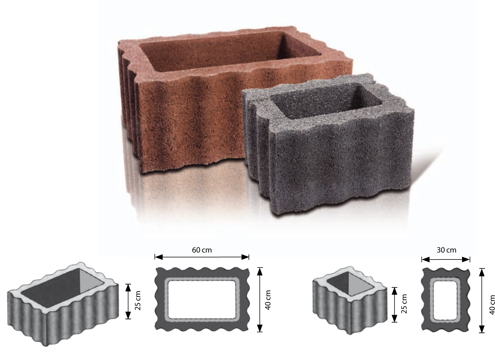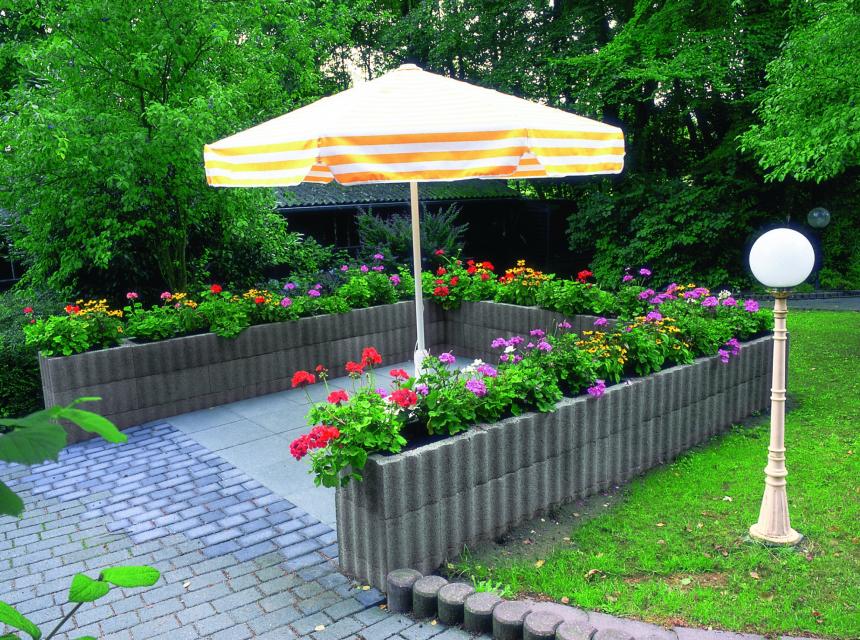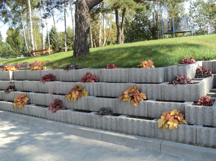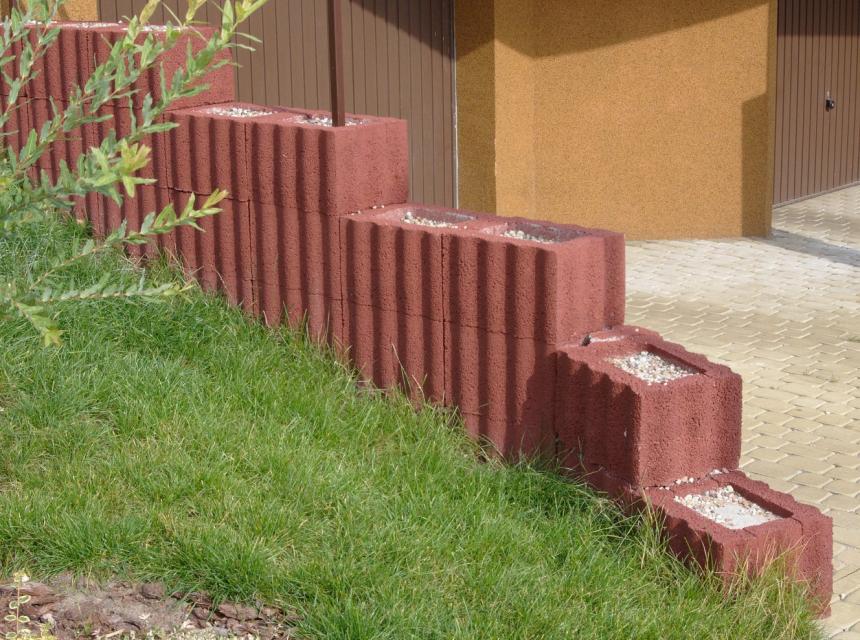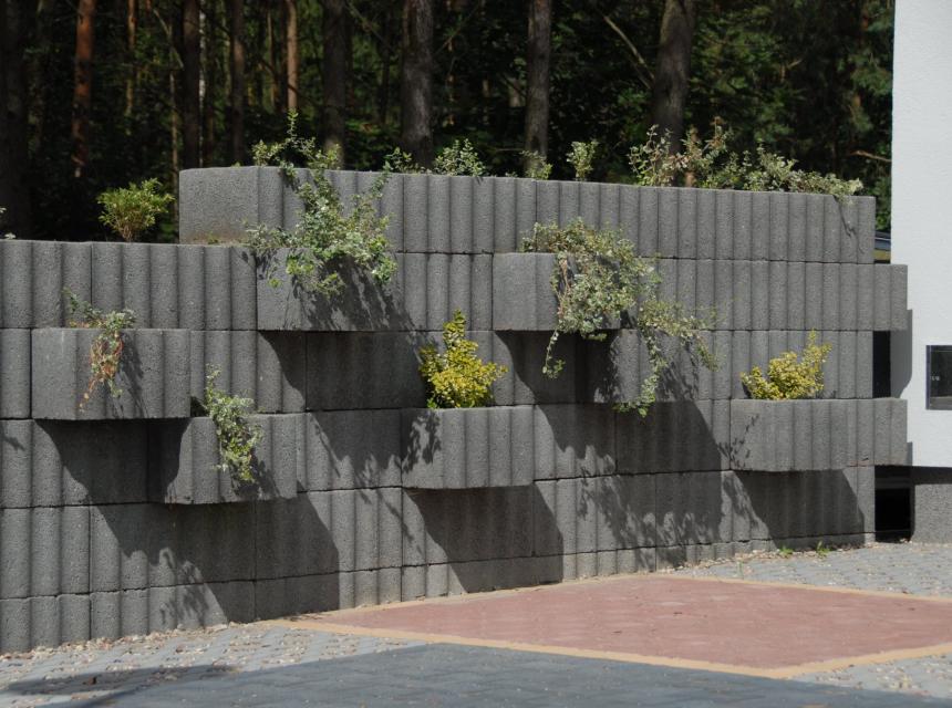 RELUFLOR to element ogrodzenia betonowego w kształcie prostokąta o sfalowanej powierzchni zewnętrznej. Dzięki takiej powierzchni kształtki dobrze zazębiają się tworząc bardzo stateczne konstrukcje. Ściany wykonane z tych elementów cechuje prostota formy i harmonia. Odwracając wybrane kształtki, tak że dłuższym bokiem będą ustawione prostopadle do ściany, otrzymamy w nich miejsce do zasadzenia roślin. W wystające części kształtek wstawiamy odpowiednie denka, zabezpieczające podłoże roślin przed wypłukaniem. Z elementów RELUFLOR możemy wykonać: umocnienie skarpy, mur ogrodzeniowy, mur oporowy, kwietnik itp.